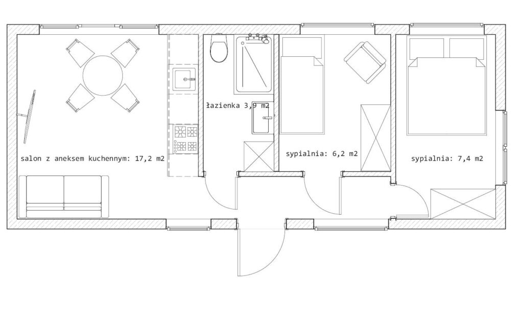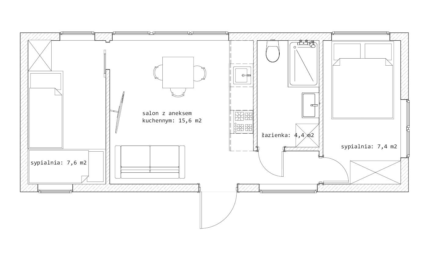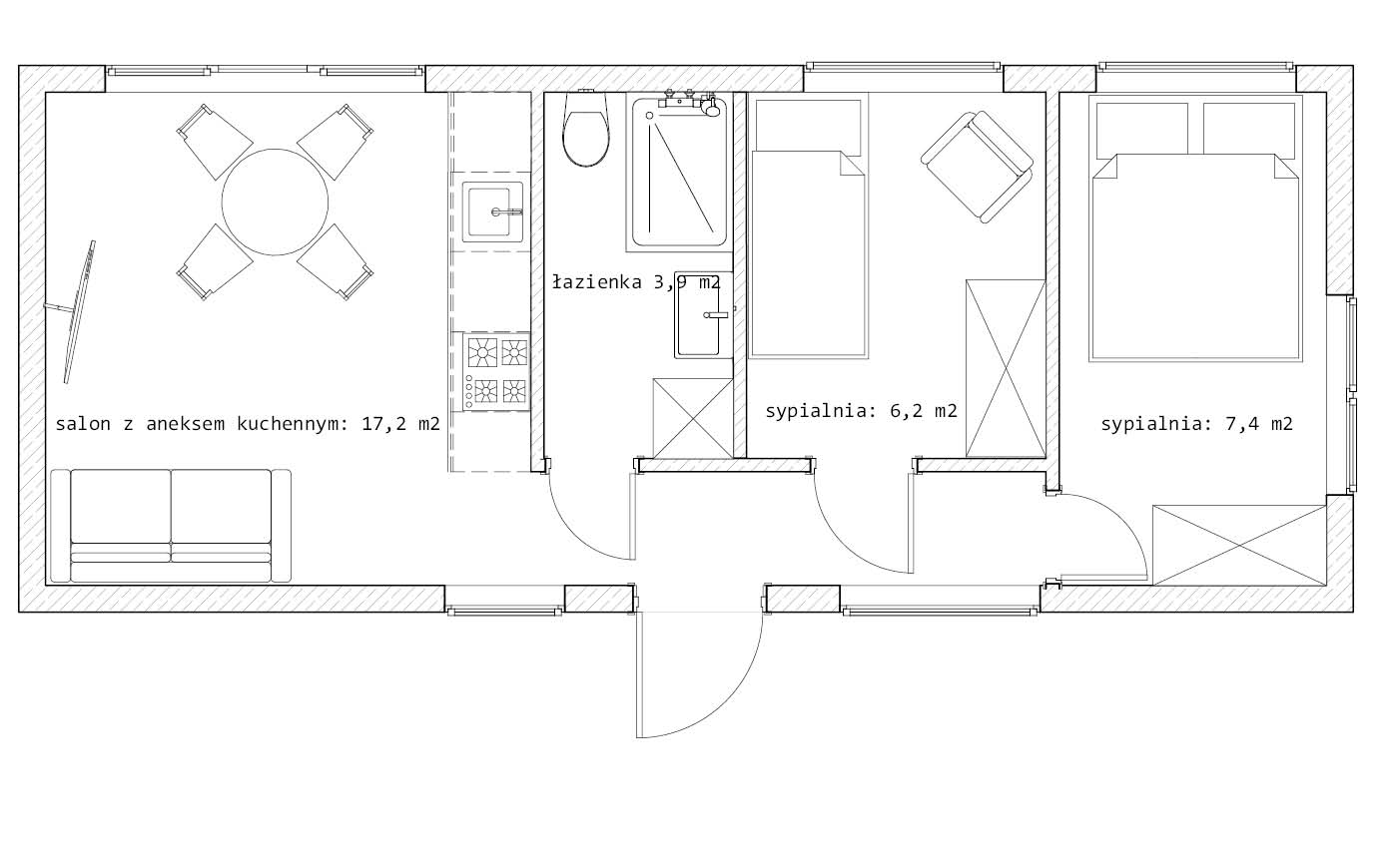 Dwie oddzielne sypialnie zapewniają prywatność i wygodę, a dodatkowe miejsca do spania, np. na rozkładanej sofie w salonie, umożliwiają elastyczne dostosowanie wnętrza do potrzeb gości. W domku znajduje się również w pełni wyposażony aneks kuchenny, funkcjonalna łazienka oraz jasna strefa dzienna sprzyjająca wspólnemu spędzaniu czasu. To idealne rozwiązanie dla tych, którzy cenią sobie wygodę, funkcjonalność i domową atmosferę – nawet na niewielkiej przestrzeni.